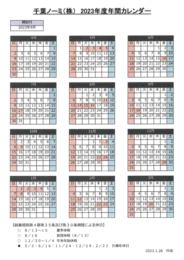 尚、弊社の年間カレンダーは以下の通りです。